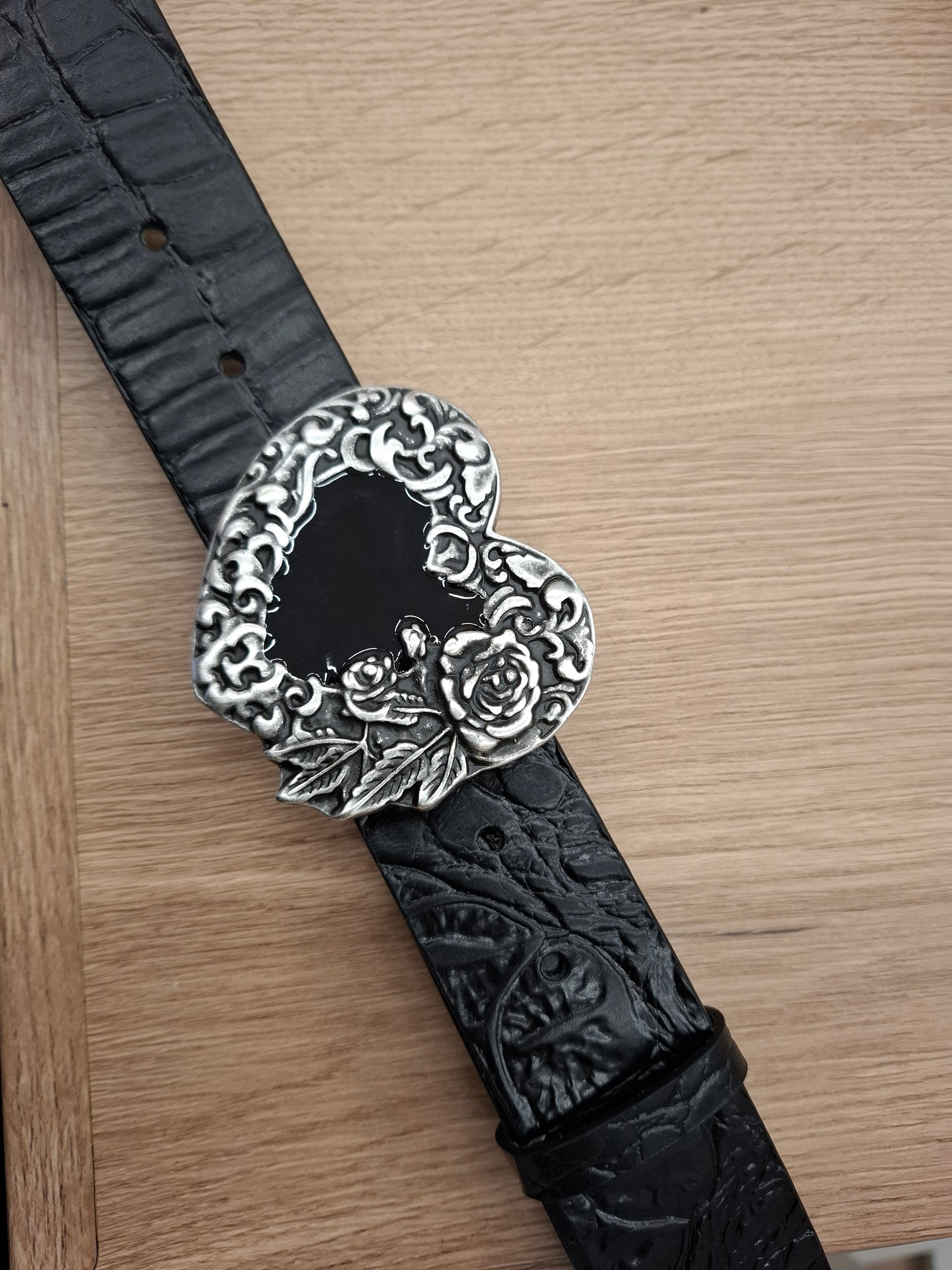 Cinturón de 100% piel vacuno de curtido vegetal con hebilla efecto envejecido en forma de corazón.