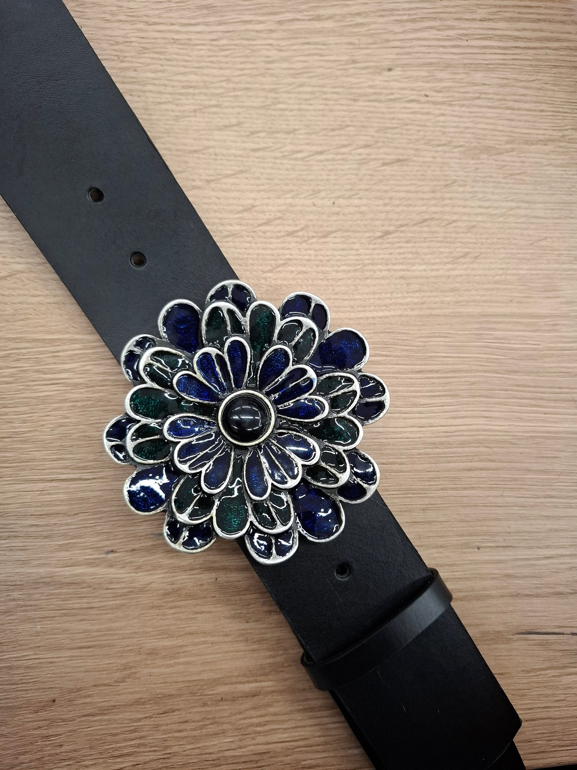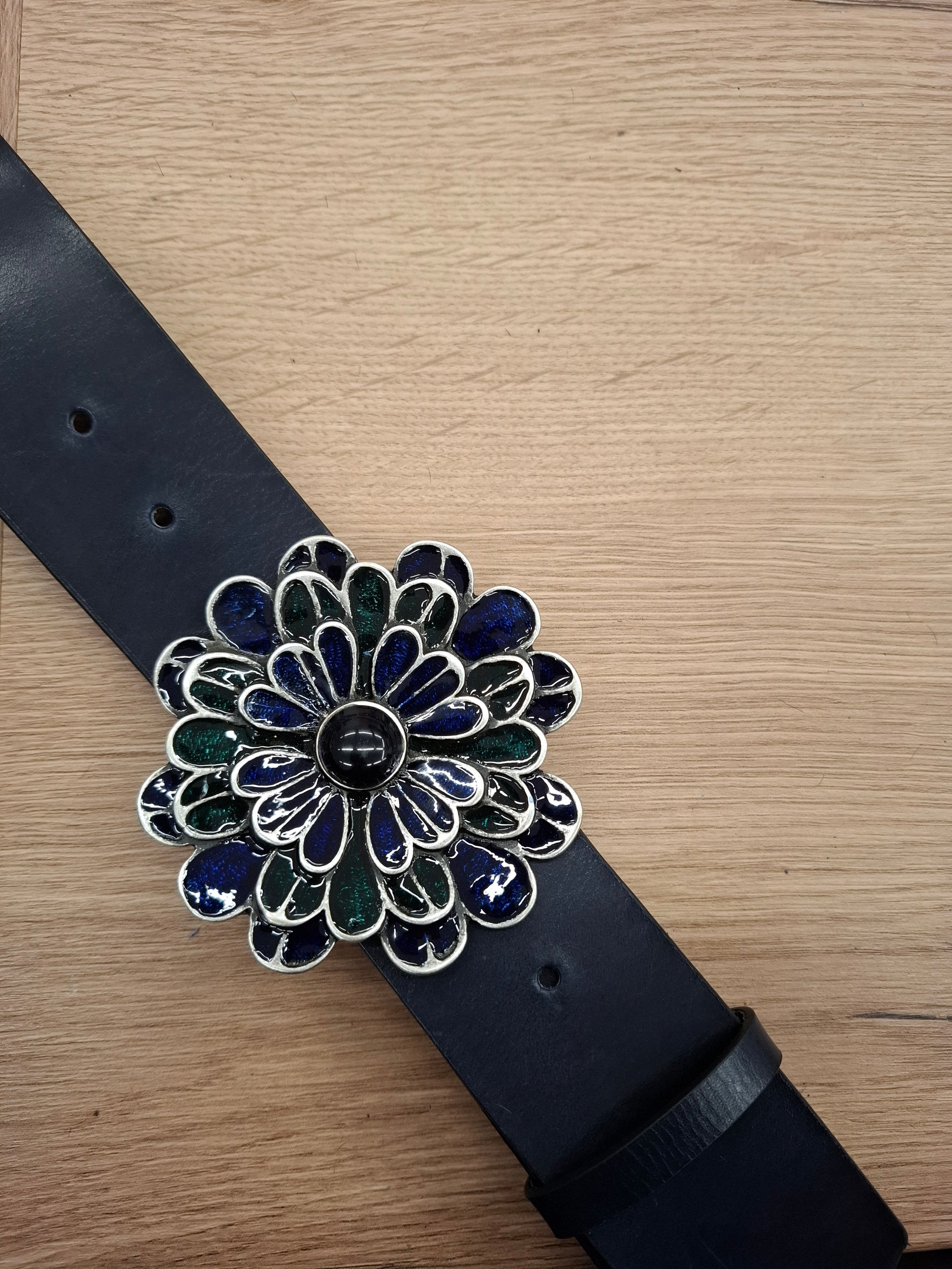 Cinturón de 100% piel vacuno de curtido vegetal con hebilla de 9cm de diámetro en color plata vieja en tonos azules y verdes y centro en negro.