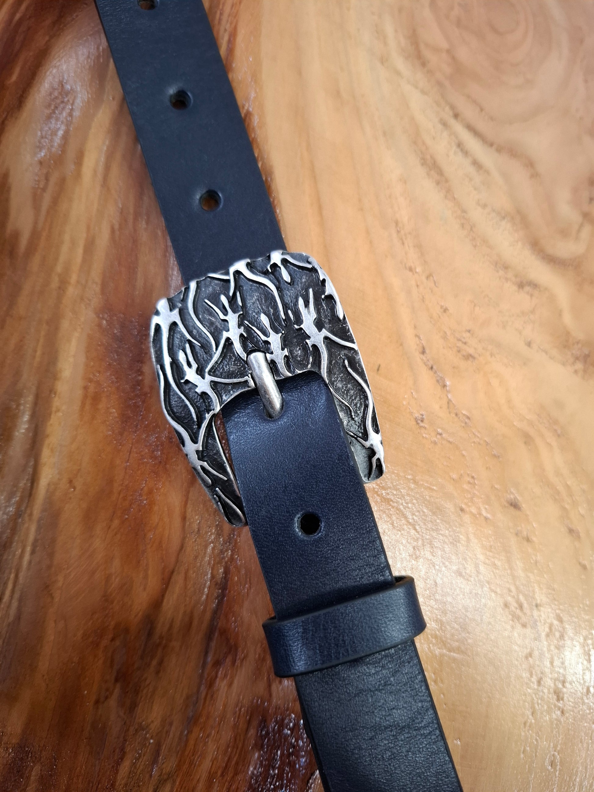 Cinturón de piel azul 2,5cm hebilla plata vieja lagartijas