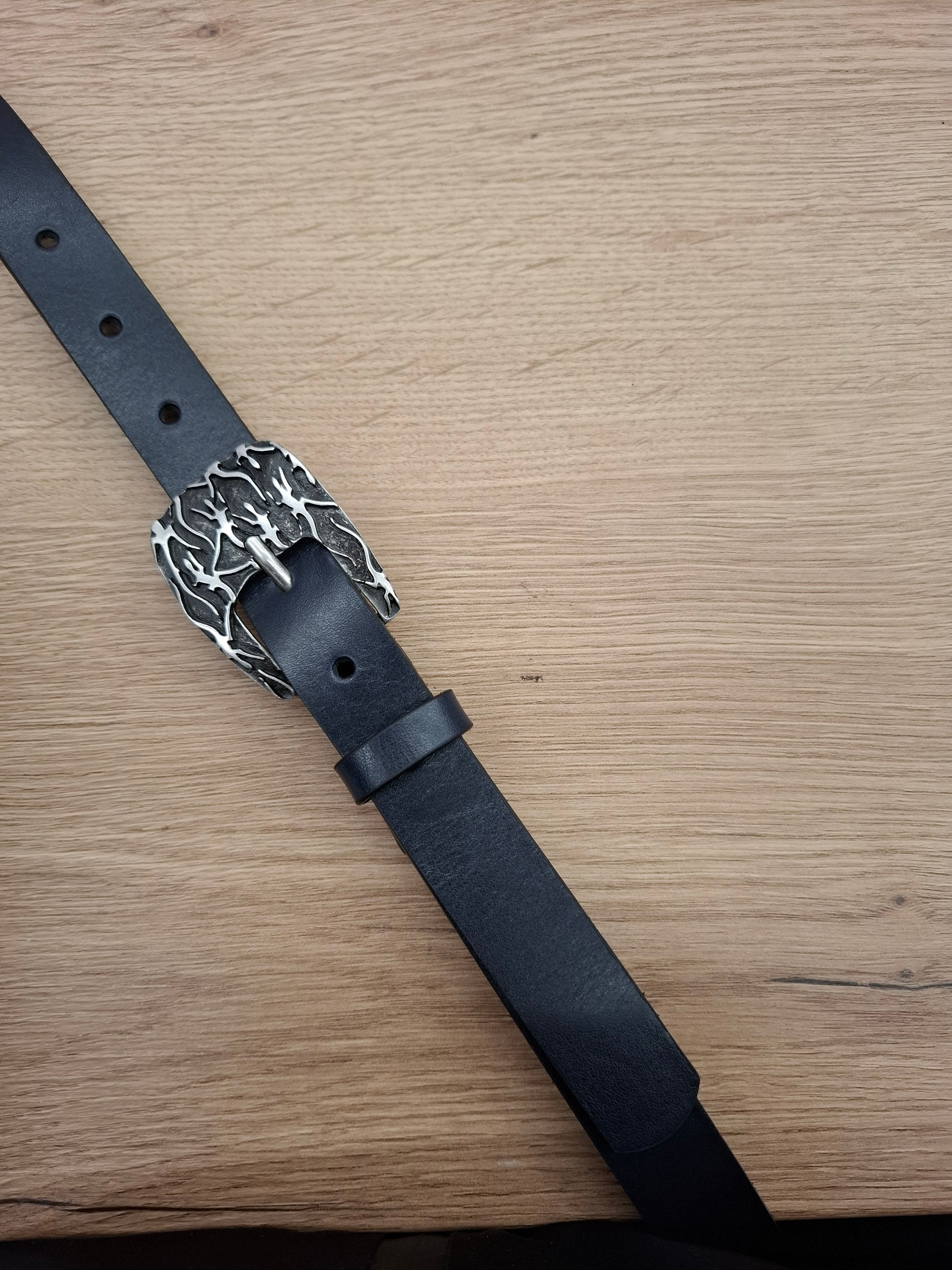 Cinturón de 100% piel vacuno de curtido vegetal con hebilla en plata vieja.