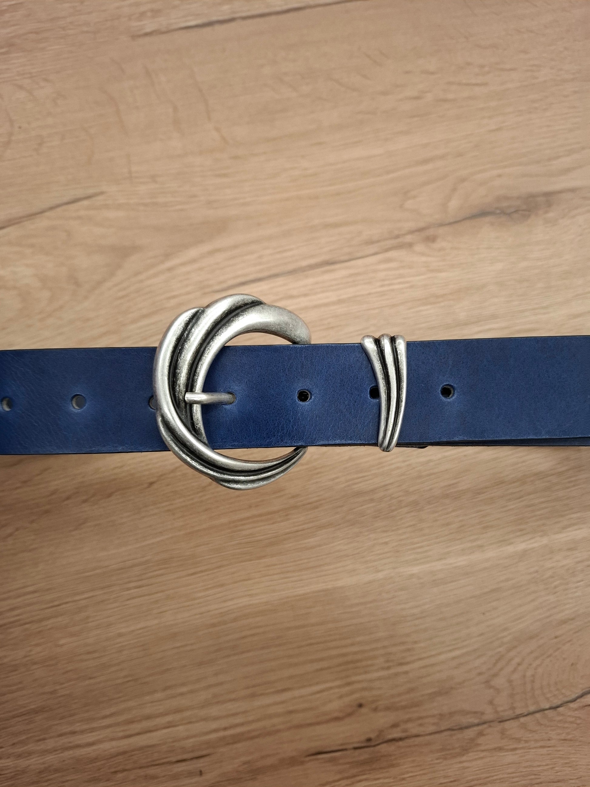 Cinturón de piel azul 3,5cm hebilla plata vieja ola
