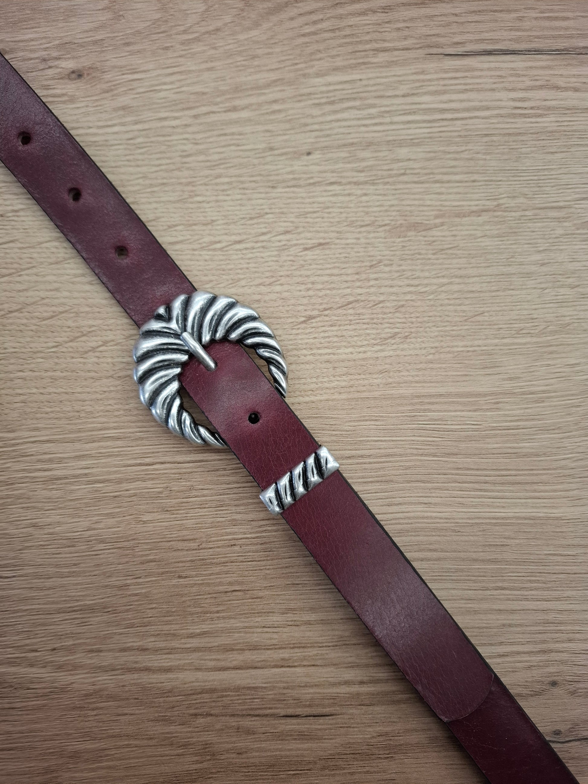 Cinturón de piel berenjena cantos negros 2,5cm hebilla palmera plata vieja