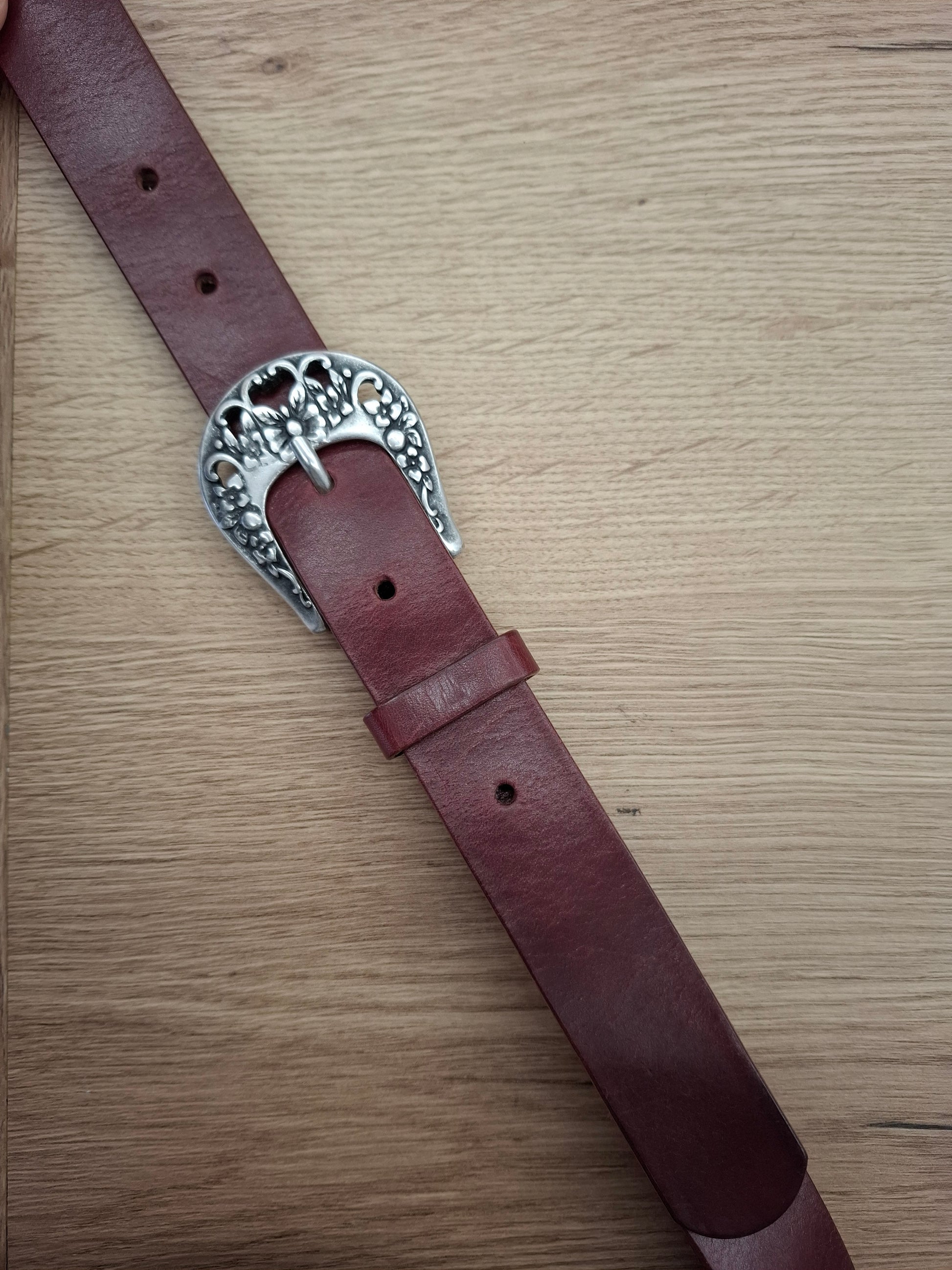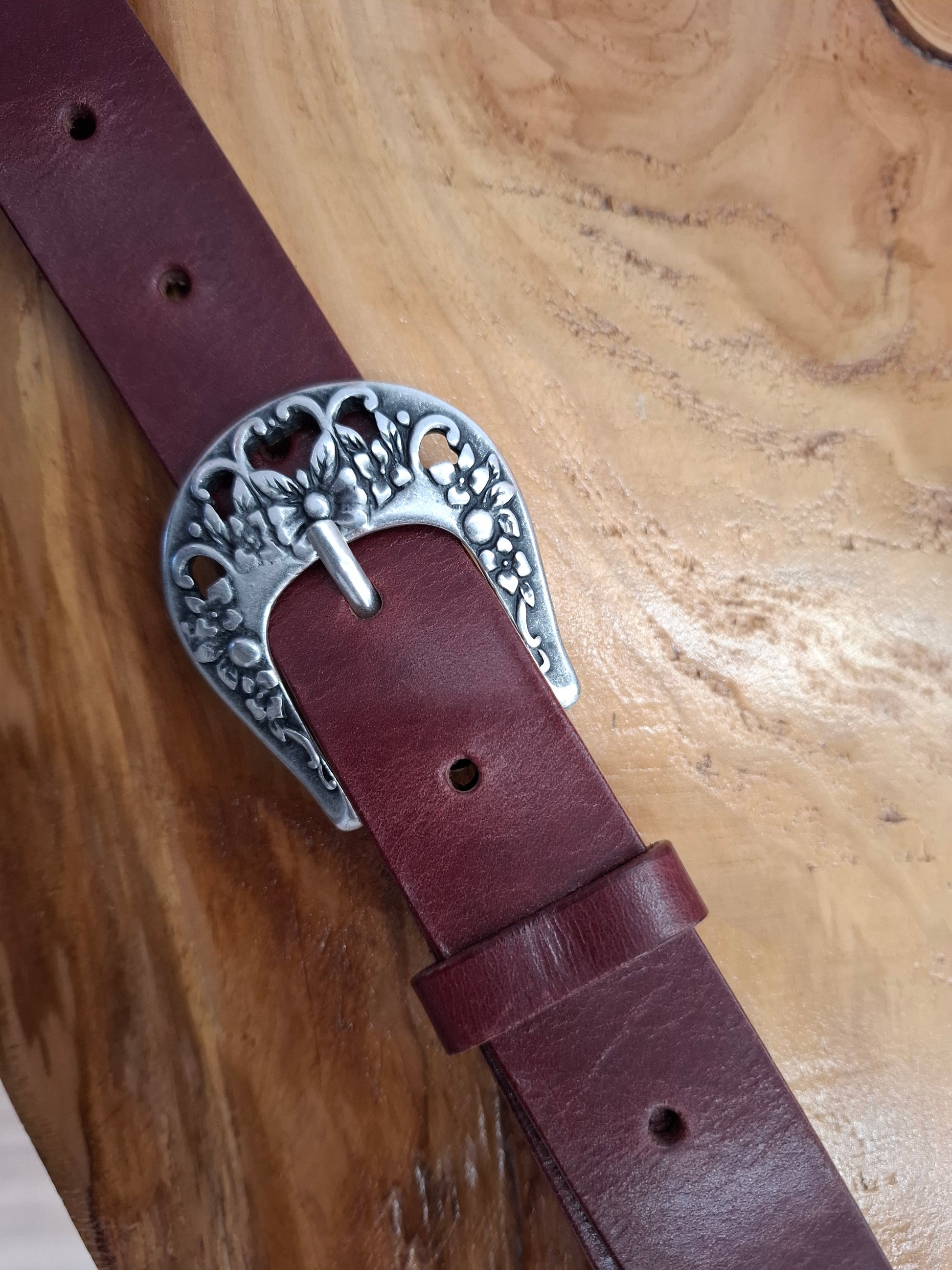 Cinturón de piel berenjena 3cm hebilla lazo plata vieja
