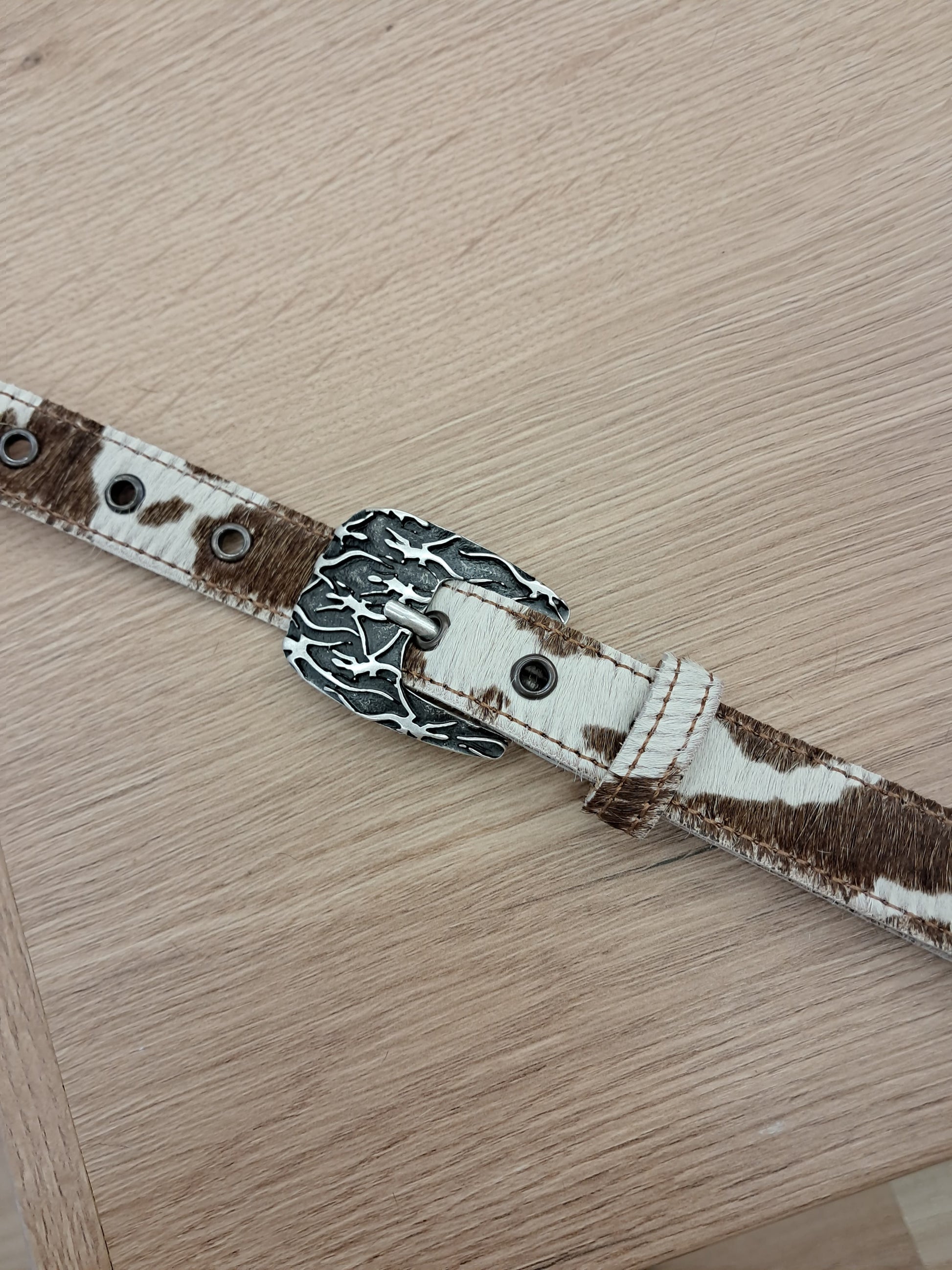 Cinturón de piel con pelo vaca 2,5cm hebilla lagartijas plata vieja