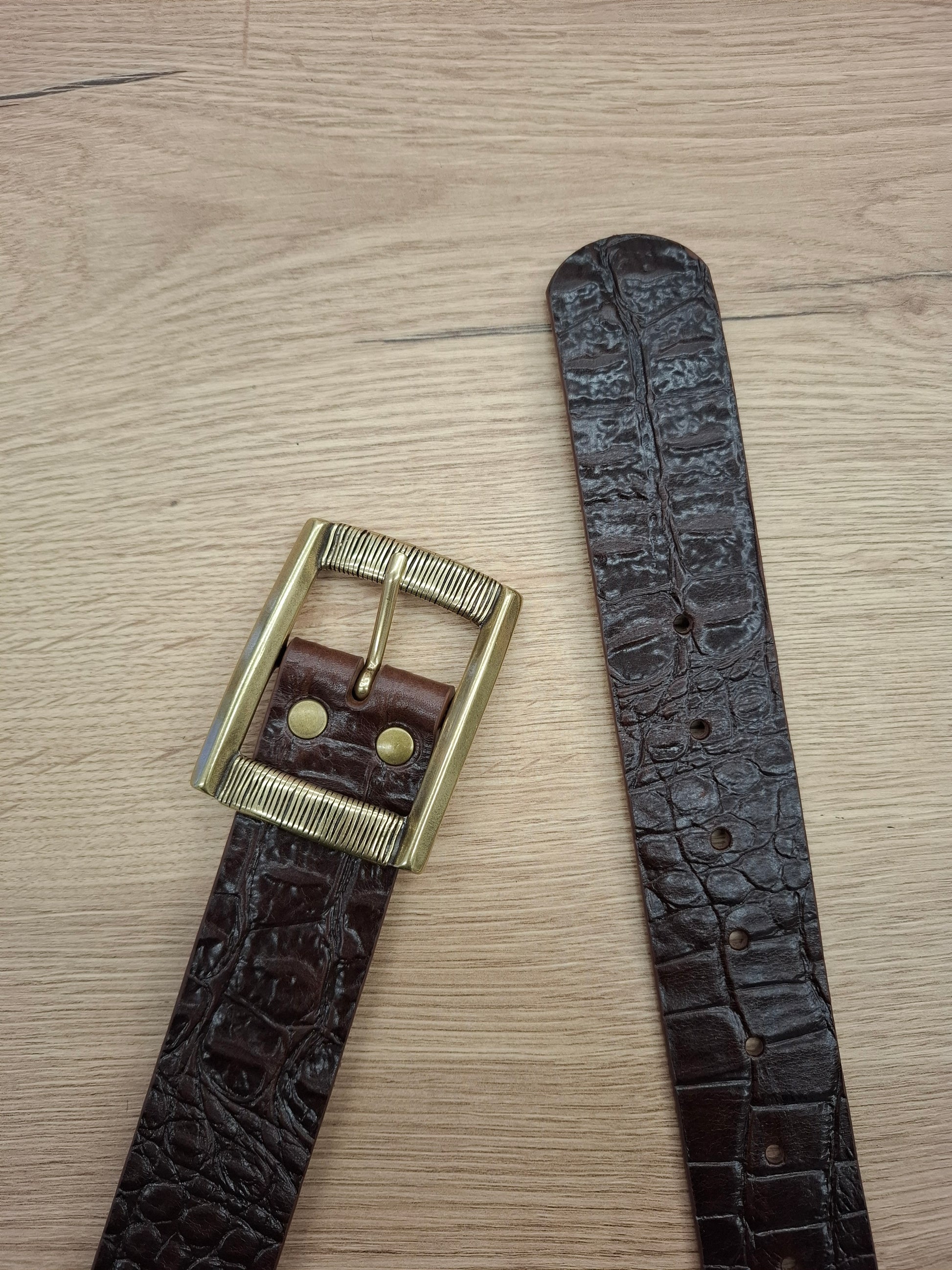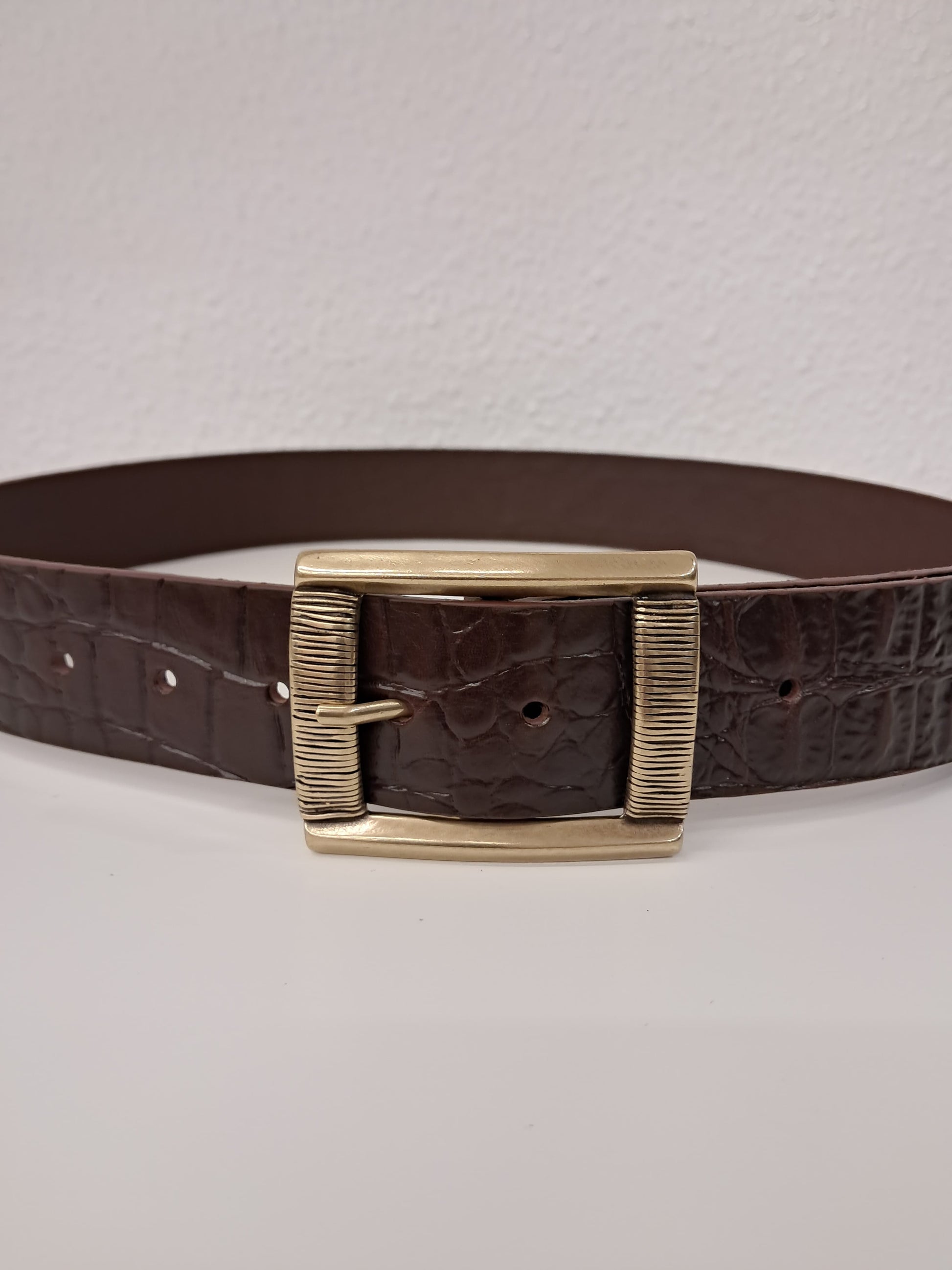 Cinturón de piel marrón coco 4cm hebilla oro viejo rayas