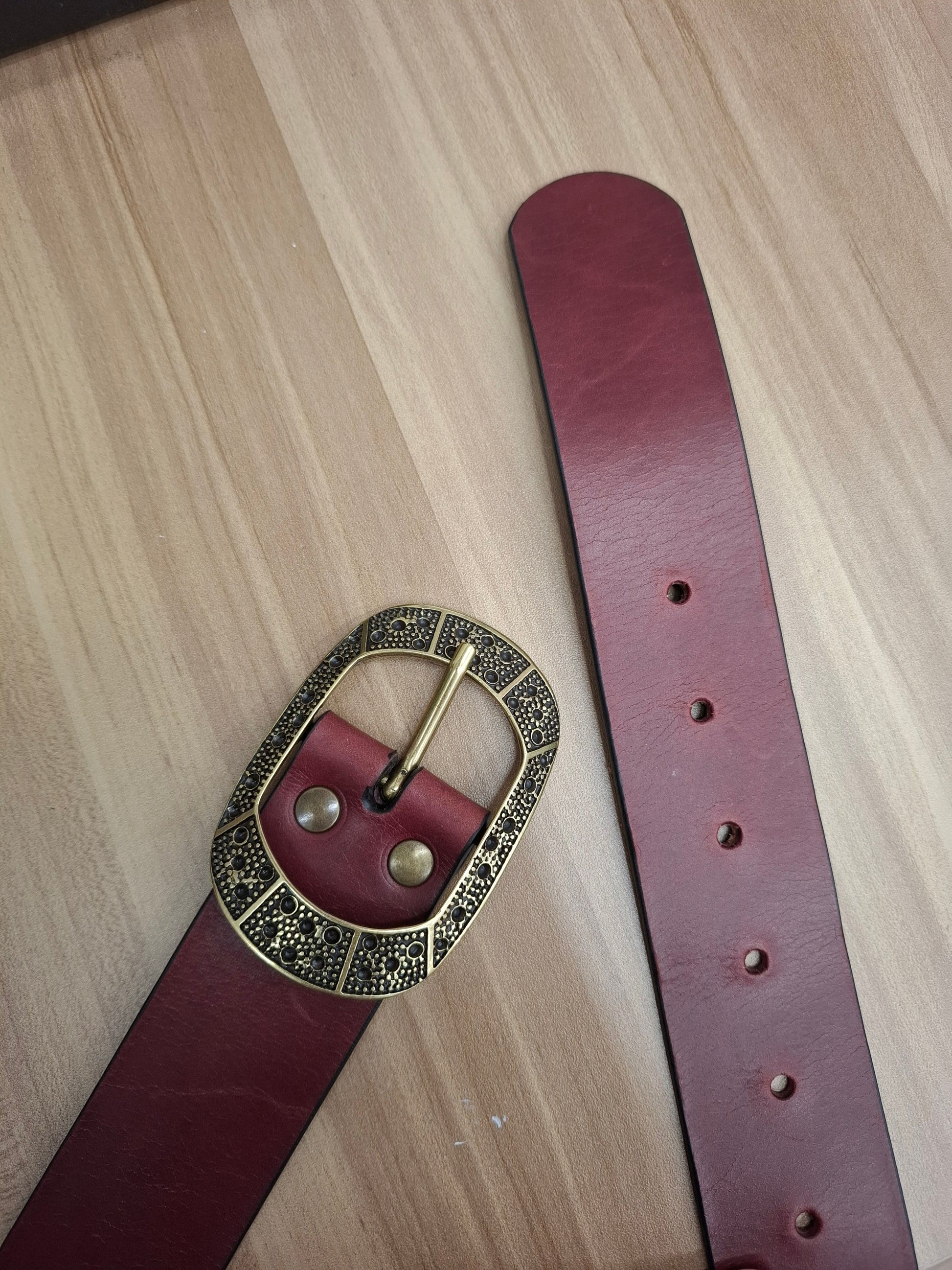 Cinturón de piel berenjena 4cm hebilla oro viejo puntos ovalada