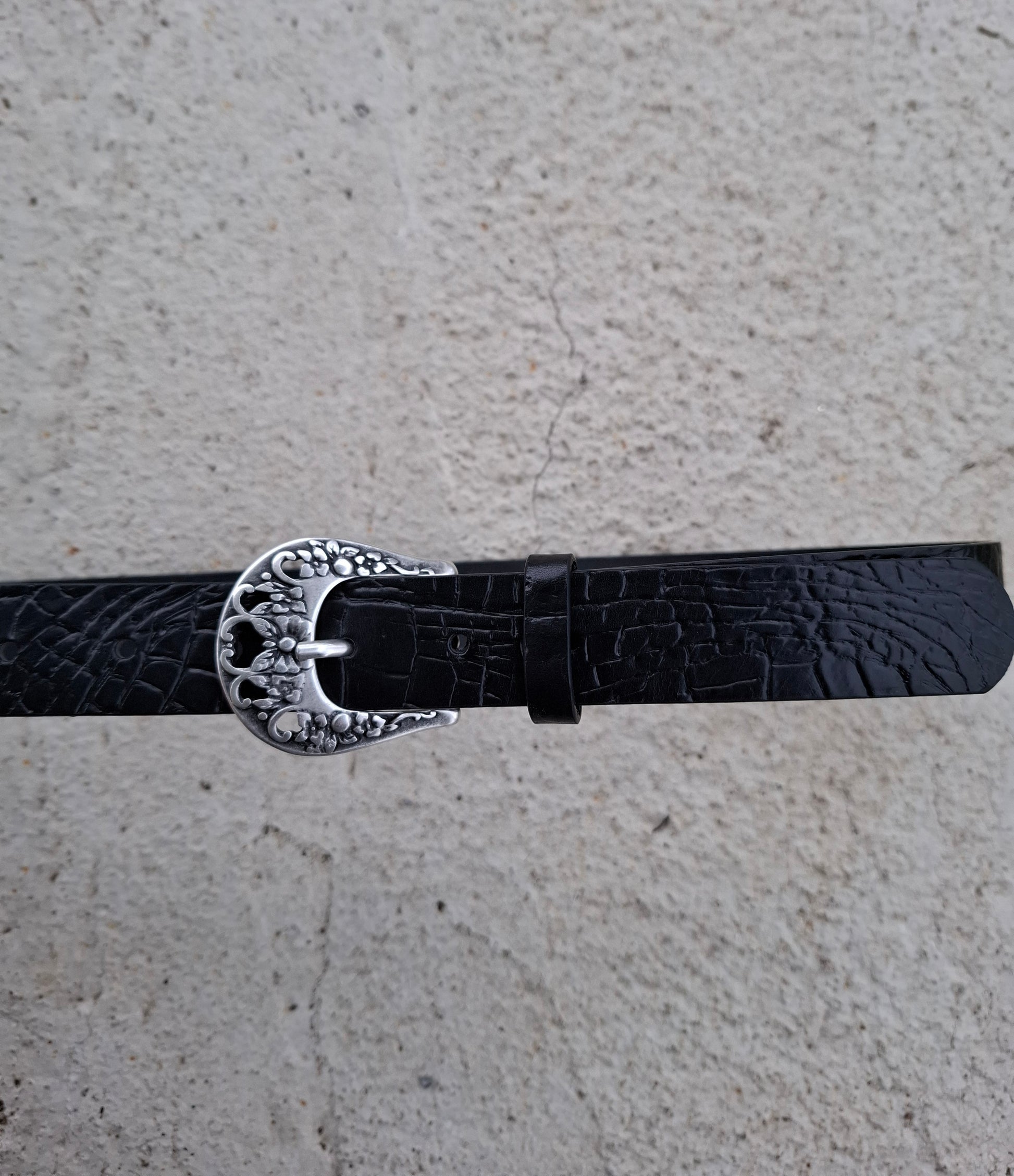 Cinturón de piel negro coco 3cm hebilla plata vieja