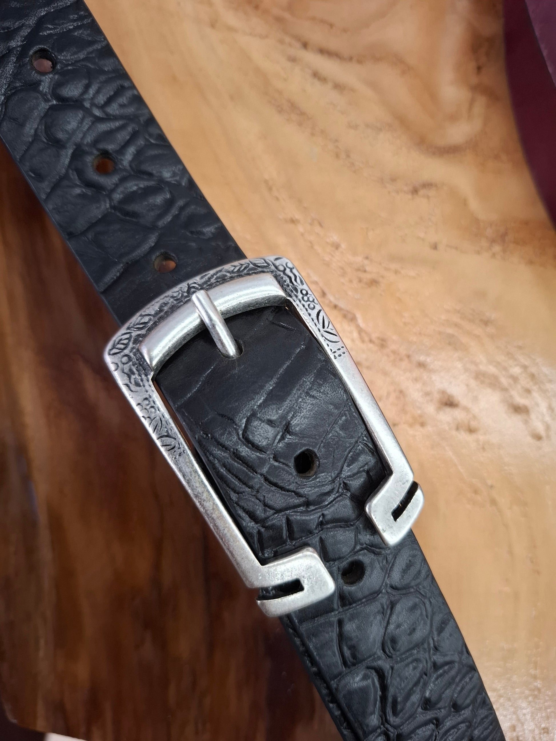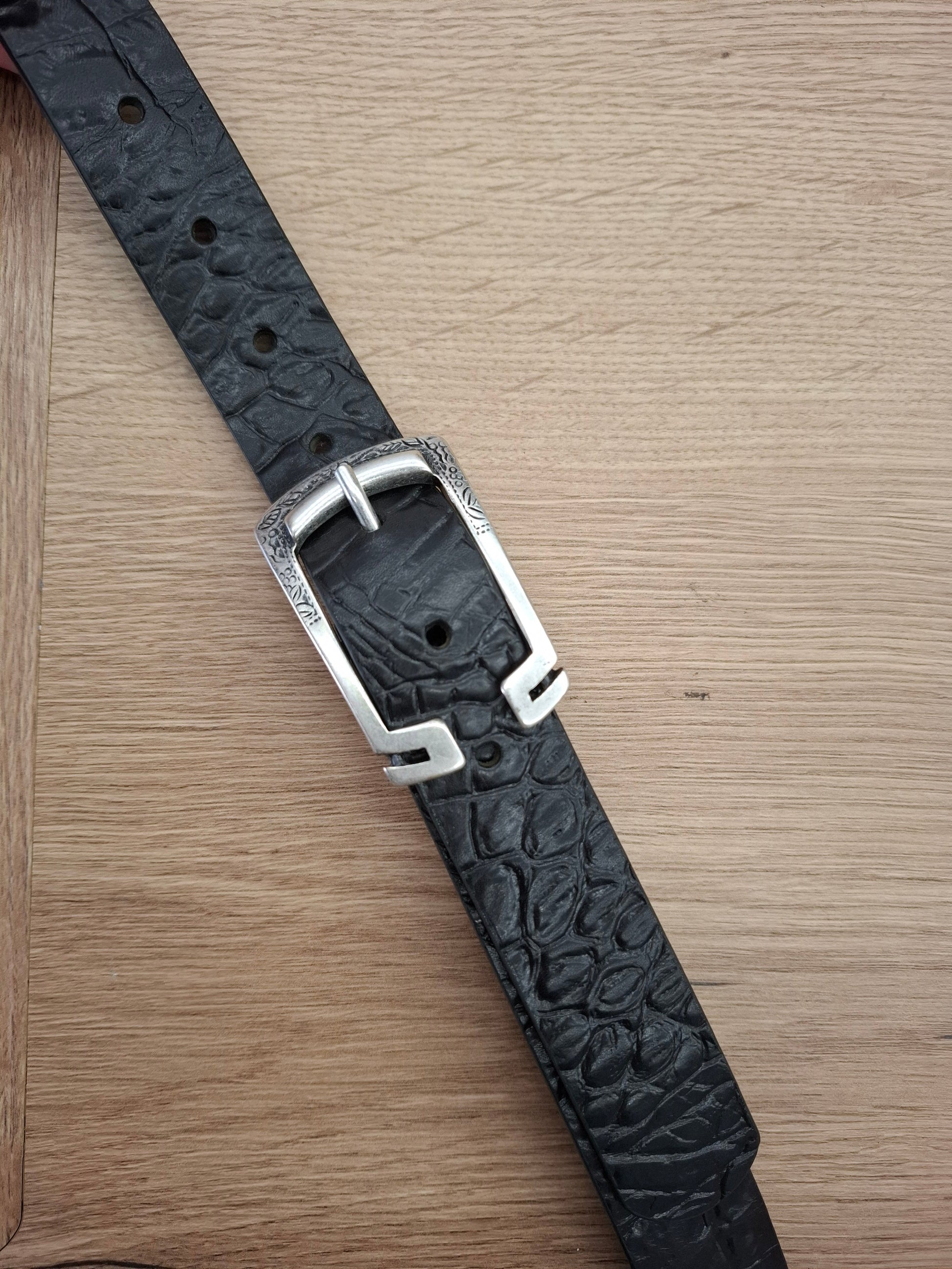 Cinturón de piel negro coco 3cm hebilla plata vieja patillas