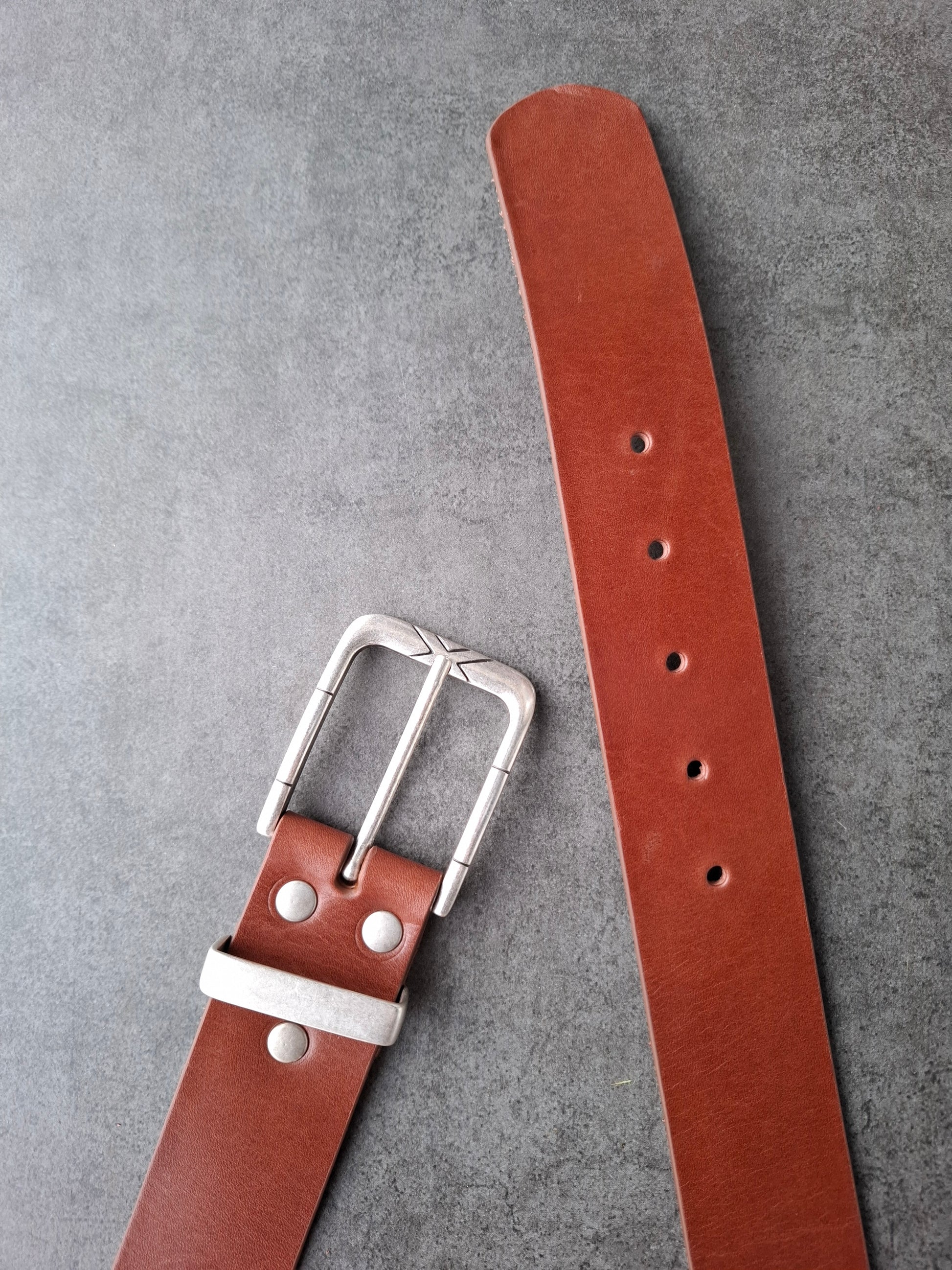 Cinturón hombre de piel marrón 4cm hebilla plata vieja con X