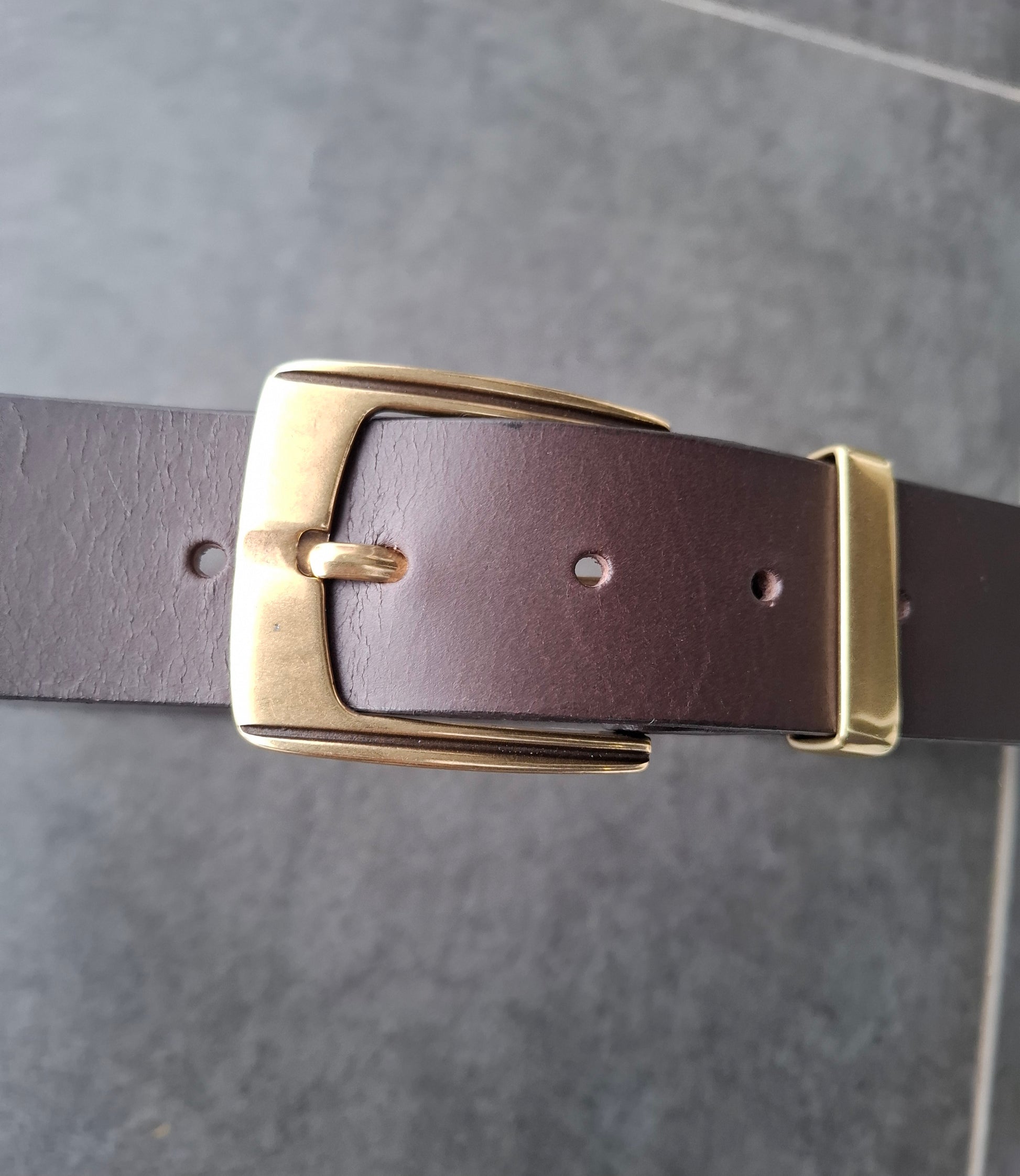 Cinturón hombre de piel marrón 4cm hebilla oro viejo con raya negra