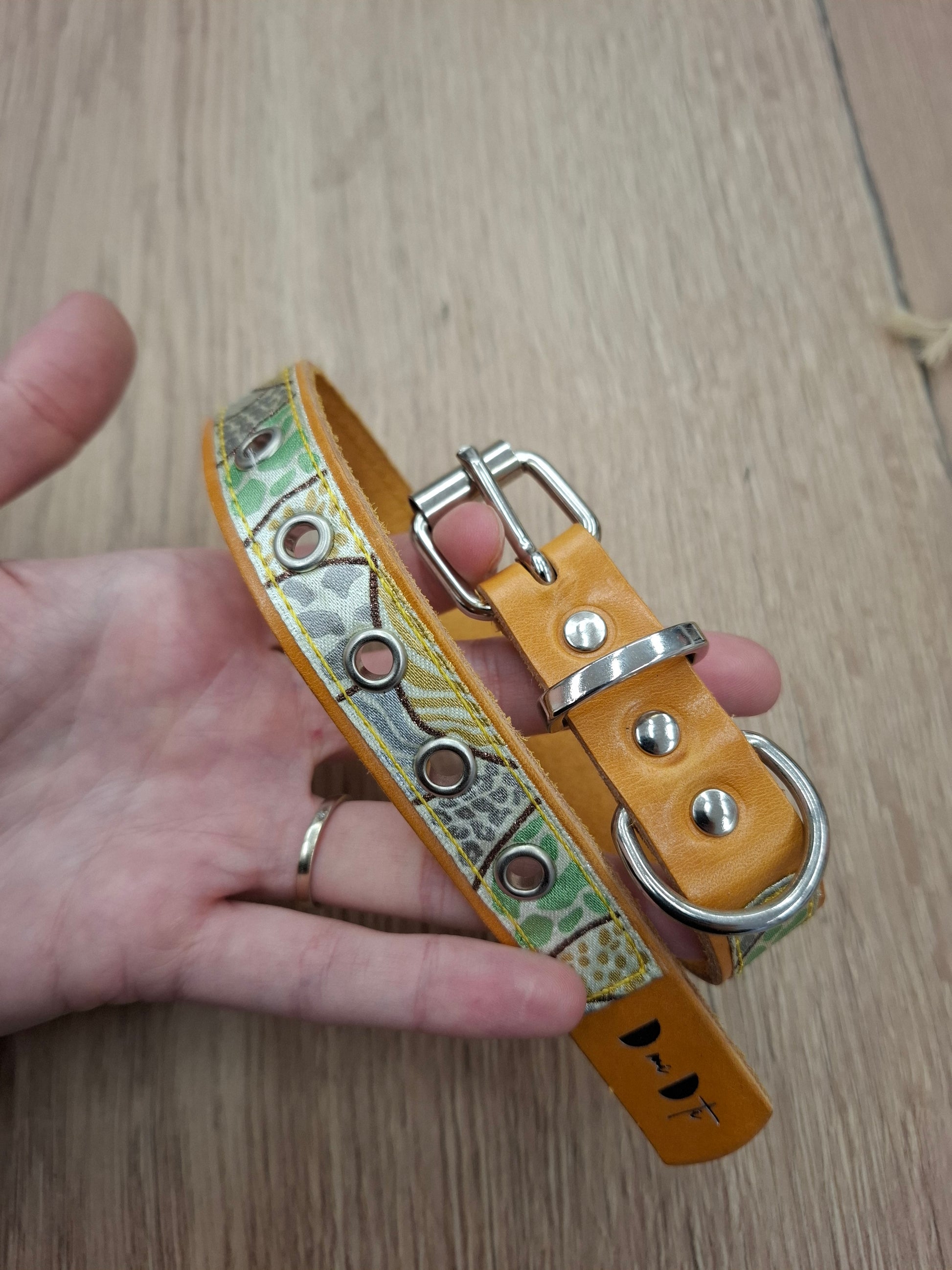 Collar de perro de piel vacuno de curtido vegetal y cinta con toques brillantes.
