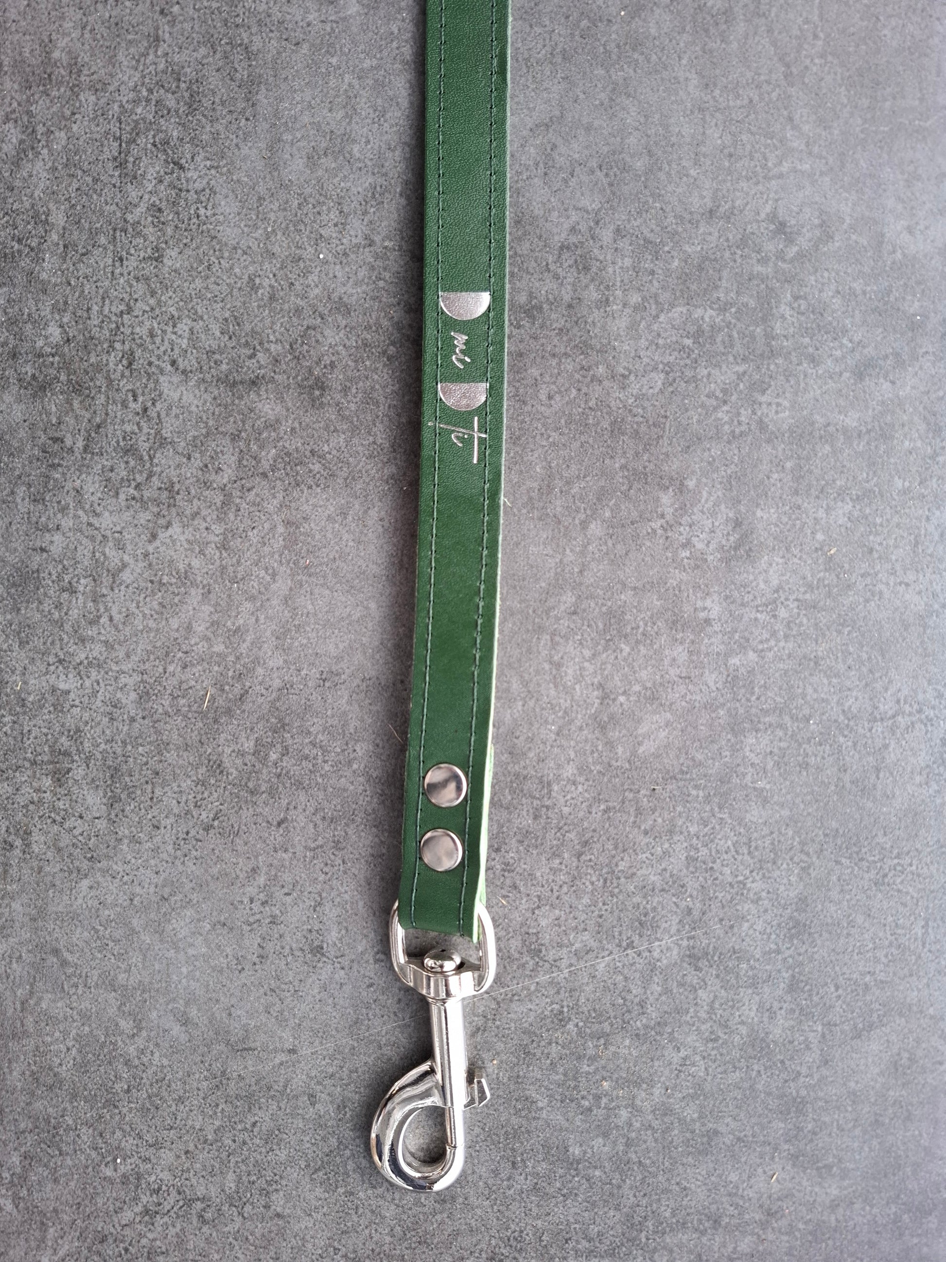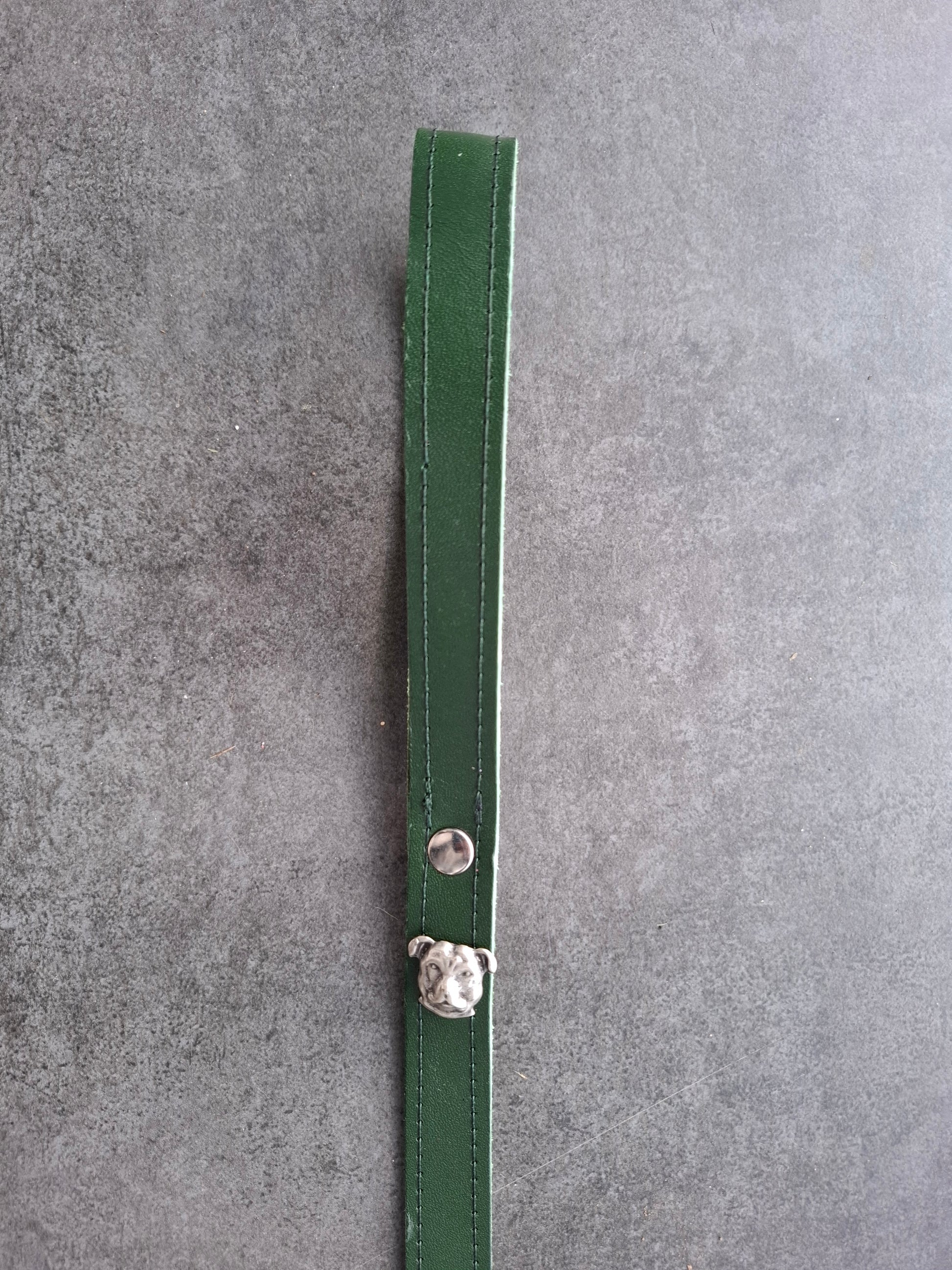 Correa de perro de piel vacuno de curtido vegetal y cinta con toques brillantes en la cara interior. Tiene un remache con forma de cabeza de perro en el asa.