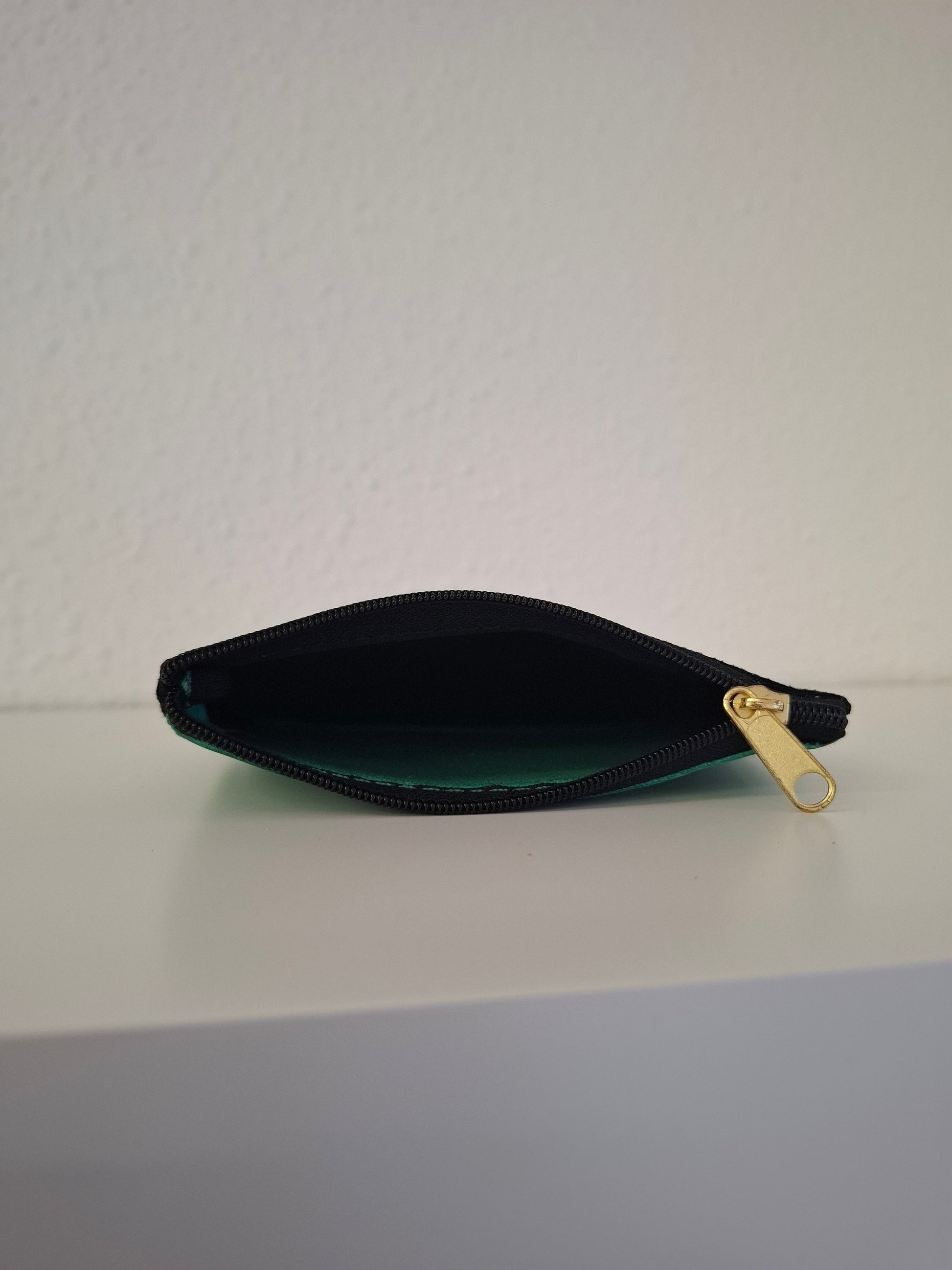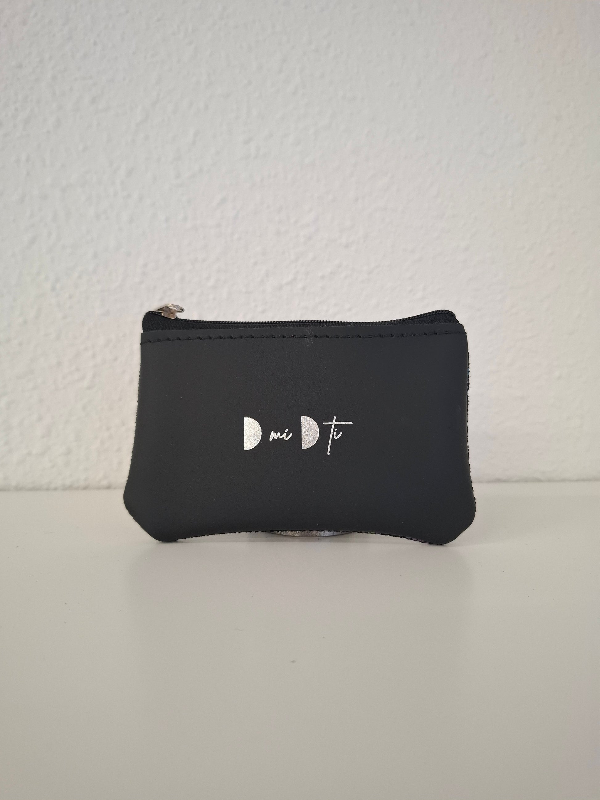 Monedero de piel estampada en la parte delantera y piel lisa en la trasera, con cierre de cremallera.