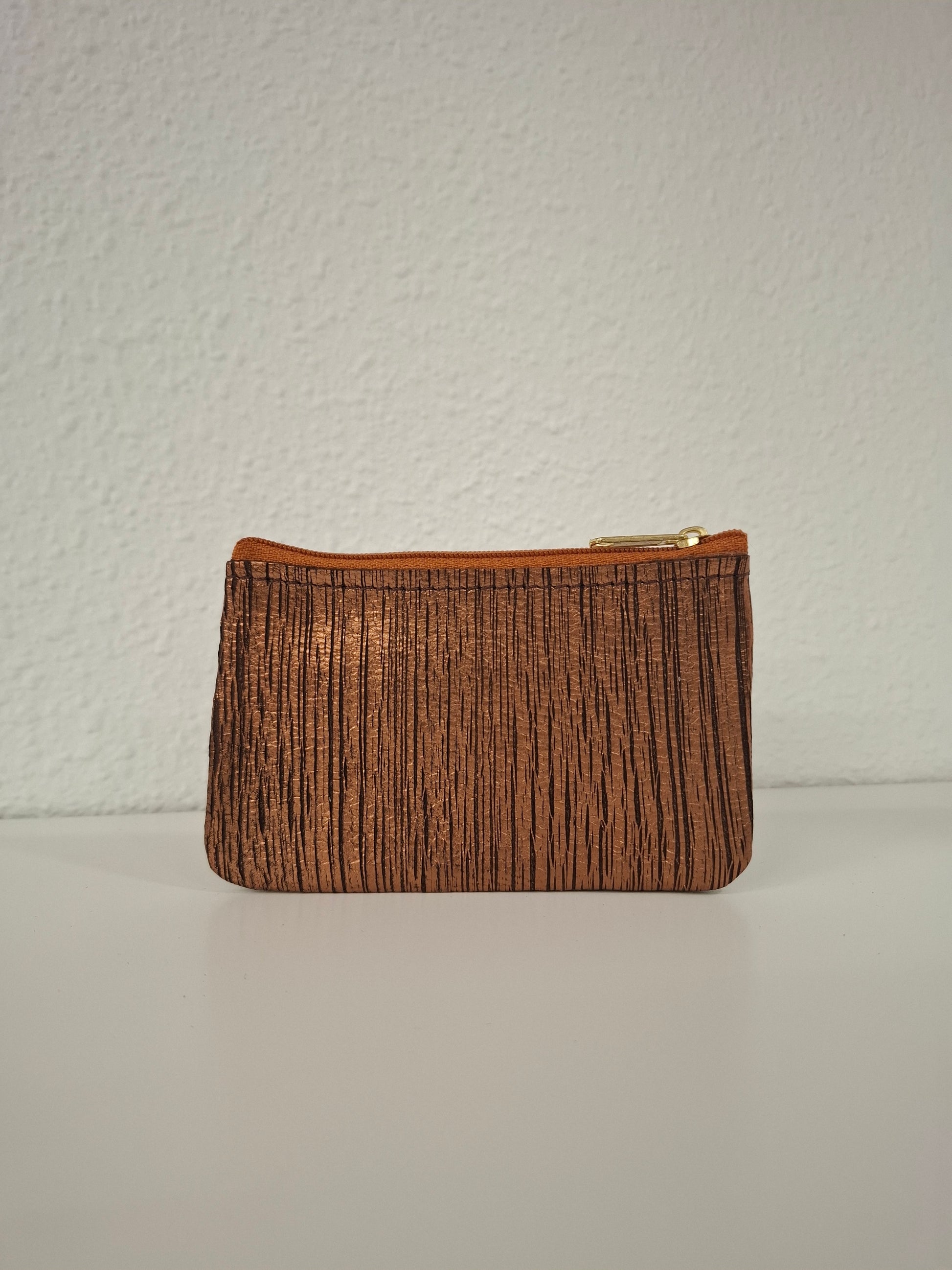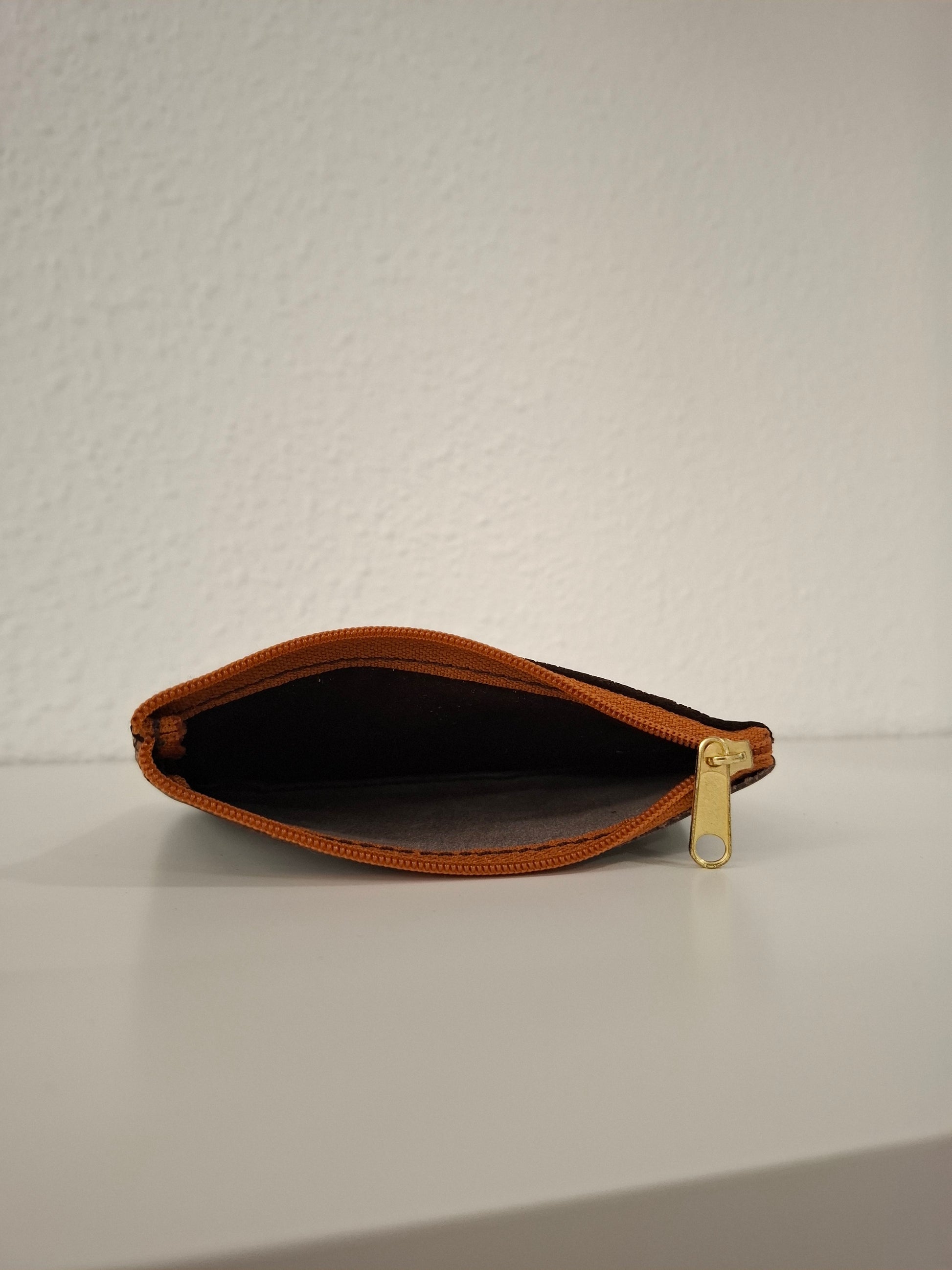 Monedero de piel estampada en la parte delantera y piel lisa en la trasera, con cierre de cremallera.