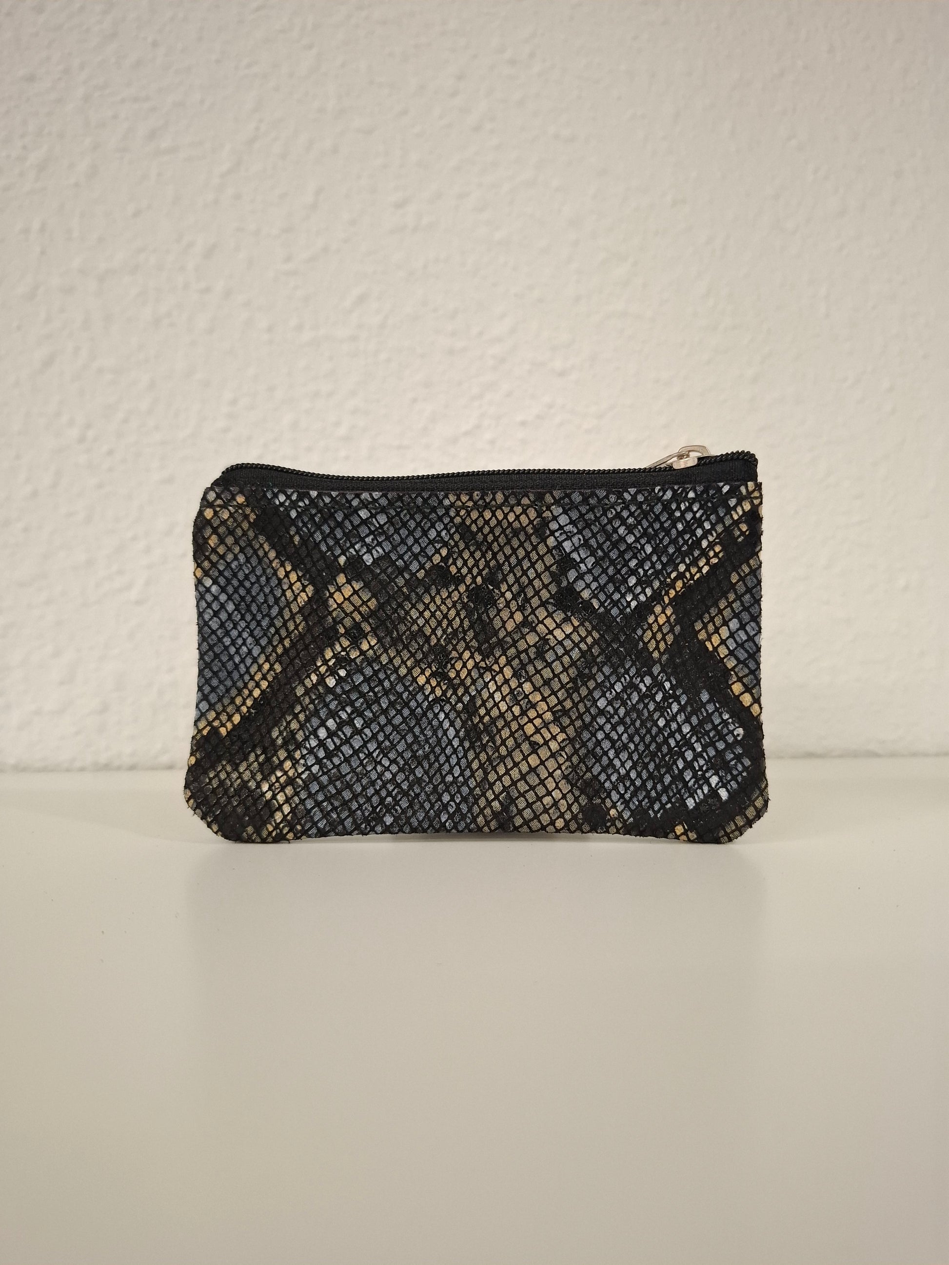 Monedero de piel estampada en la parte delantera y piel lisa en la trasera, con cierre de cremallera.
