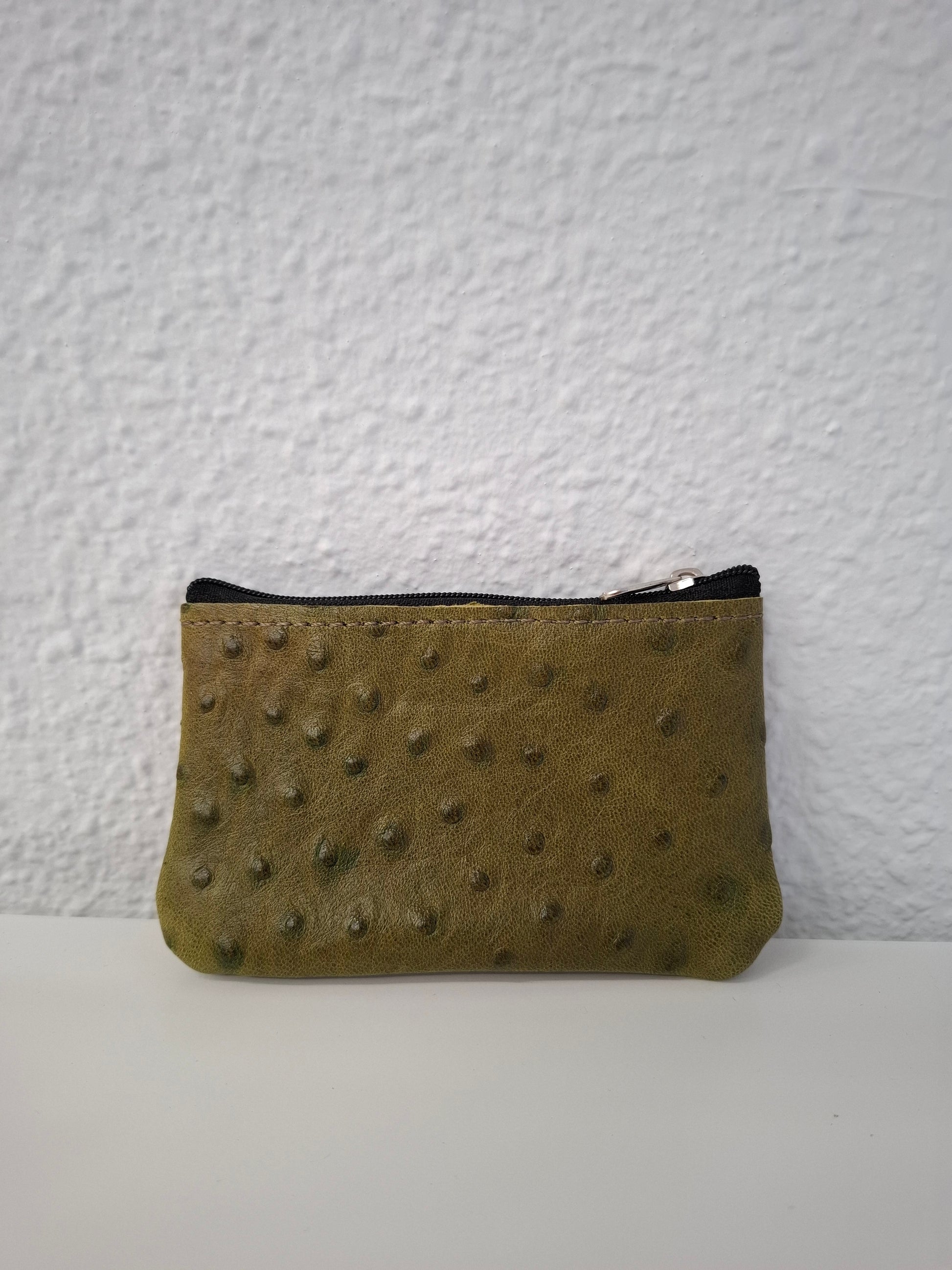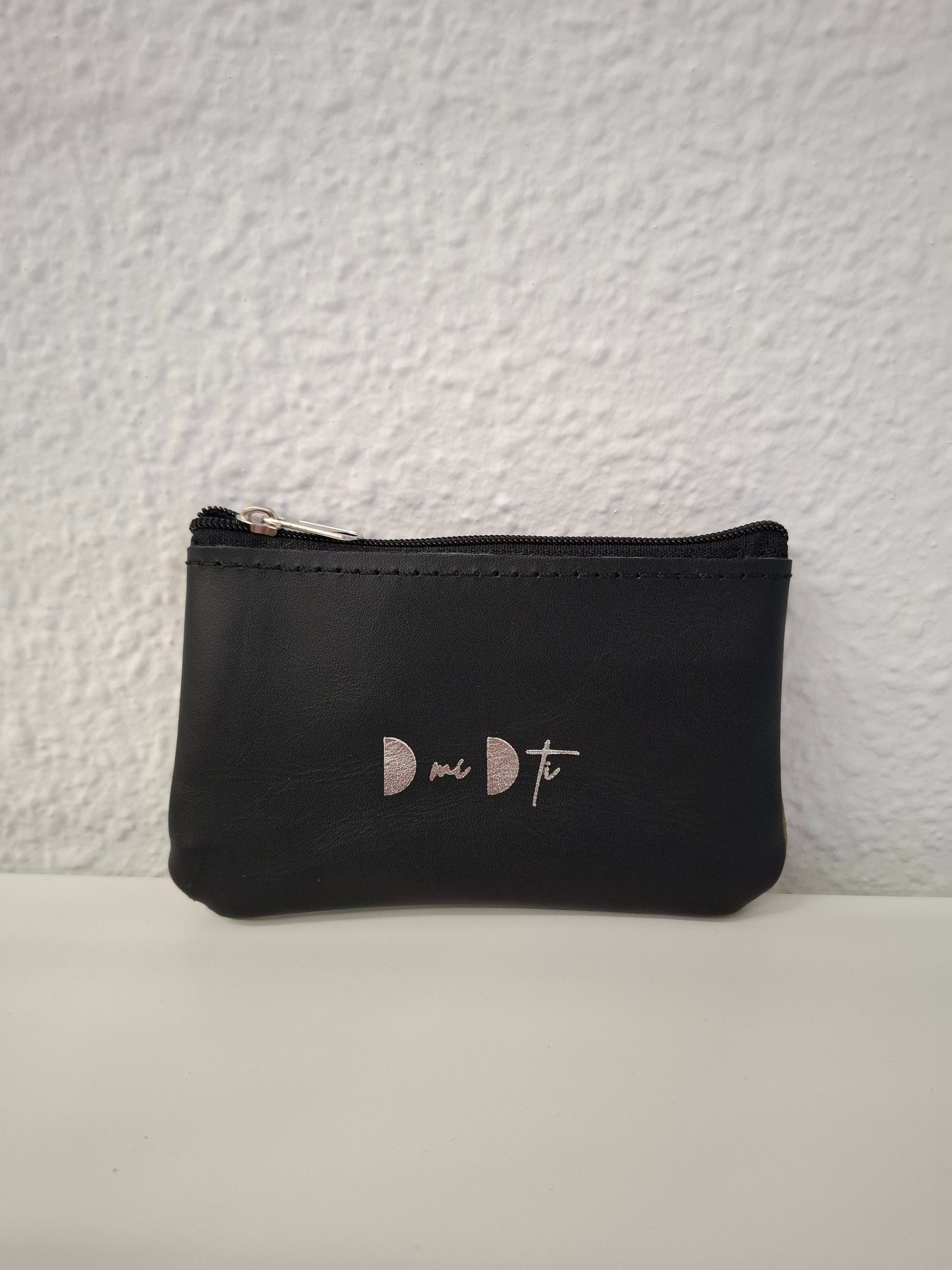 Monedero de piel estampada en la parte delantera y piel lisa en la trasera, con cierre de cremallera.