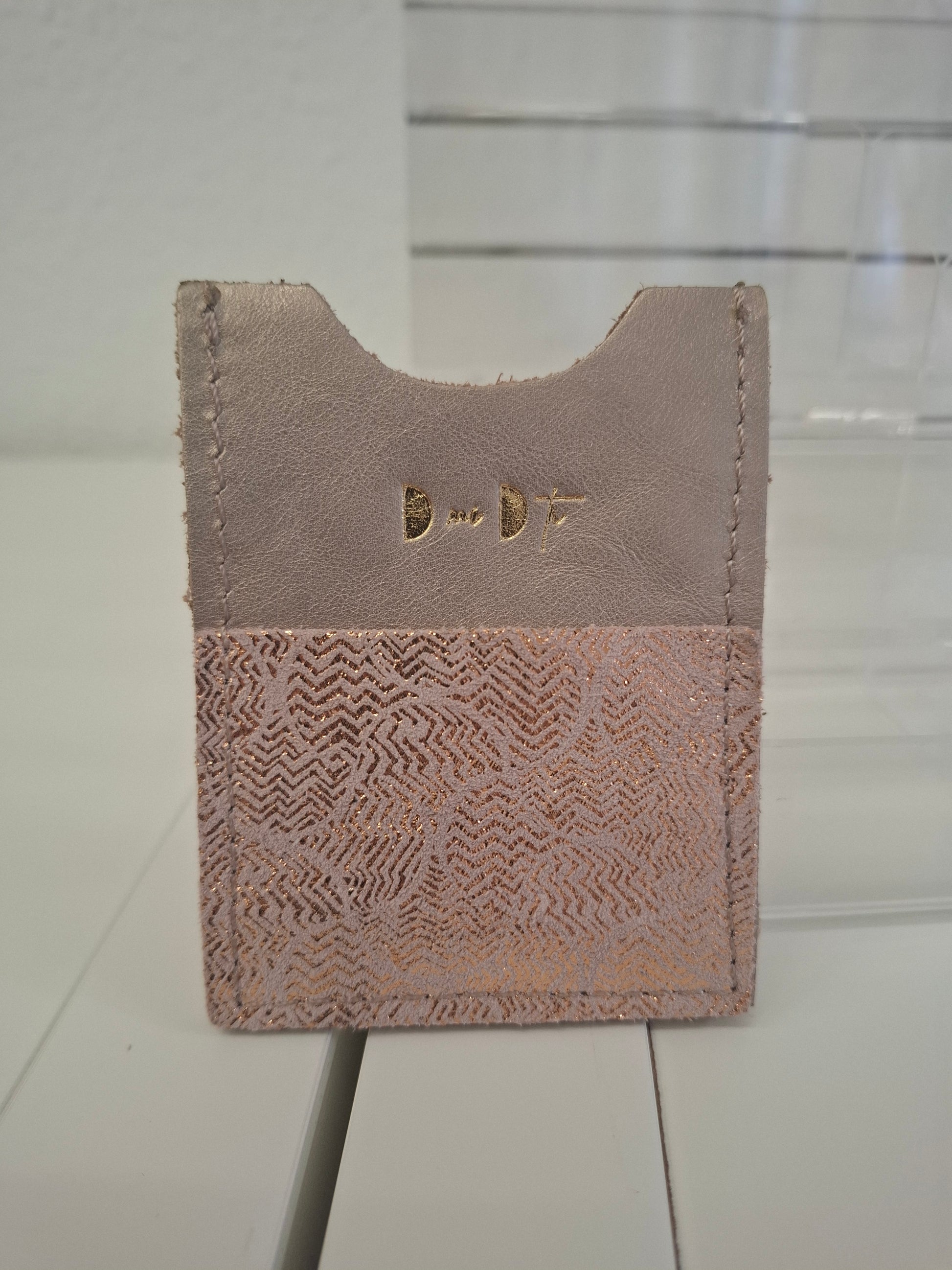 Tarjetero de piel con cabida para tres tarjetas, una a cada lado y otra en medio.